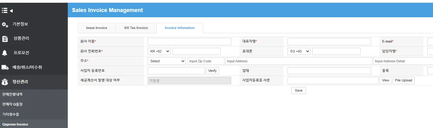 [JQSM 로그인]> [정산관리] > [Qxpress Invoice] > [Invoice Infomation] 탭에서 등록 가능합니다.