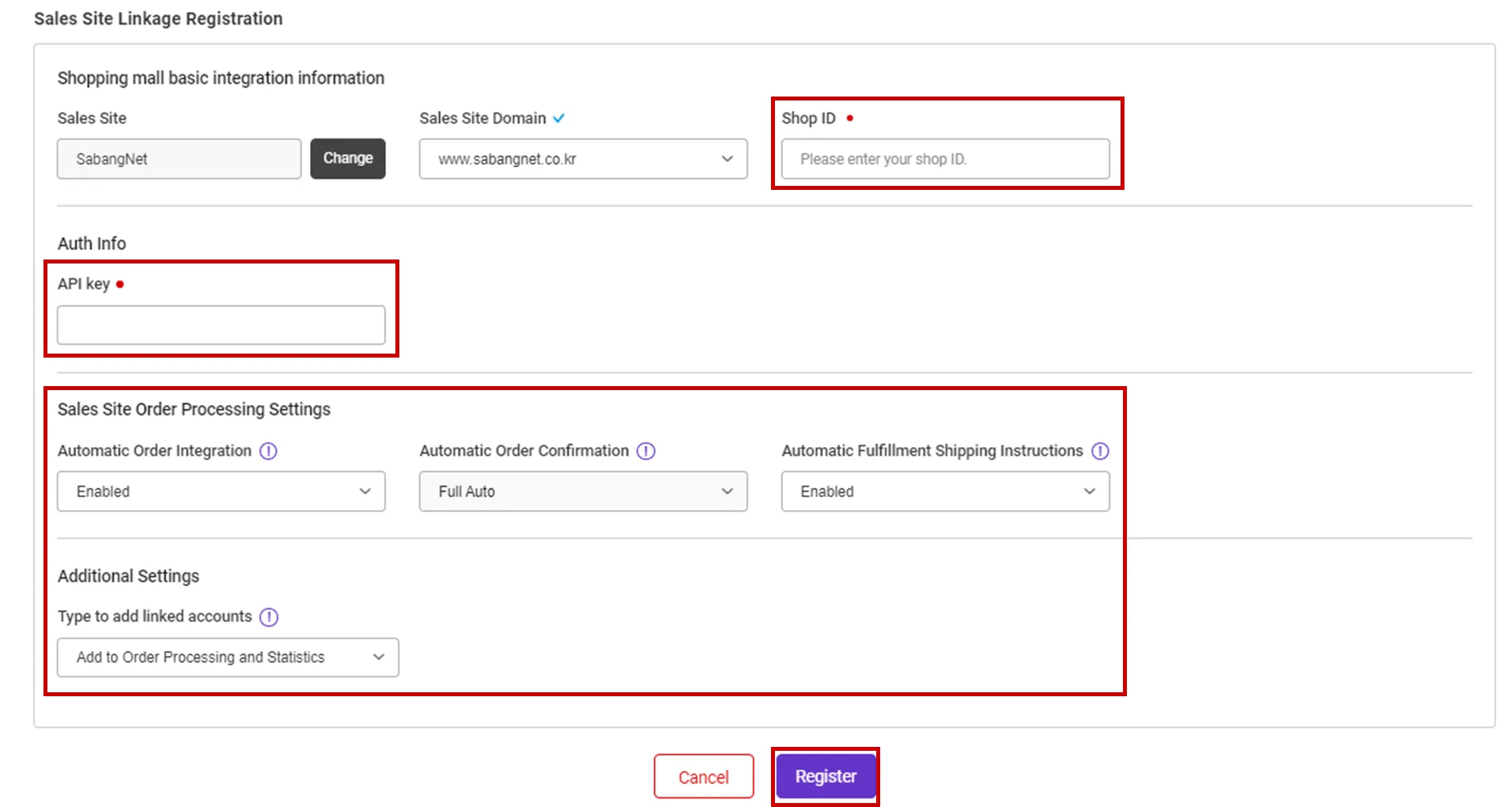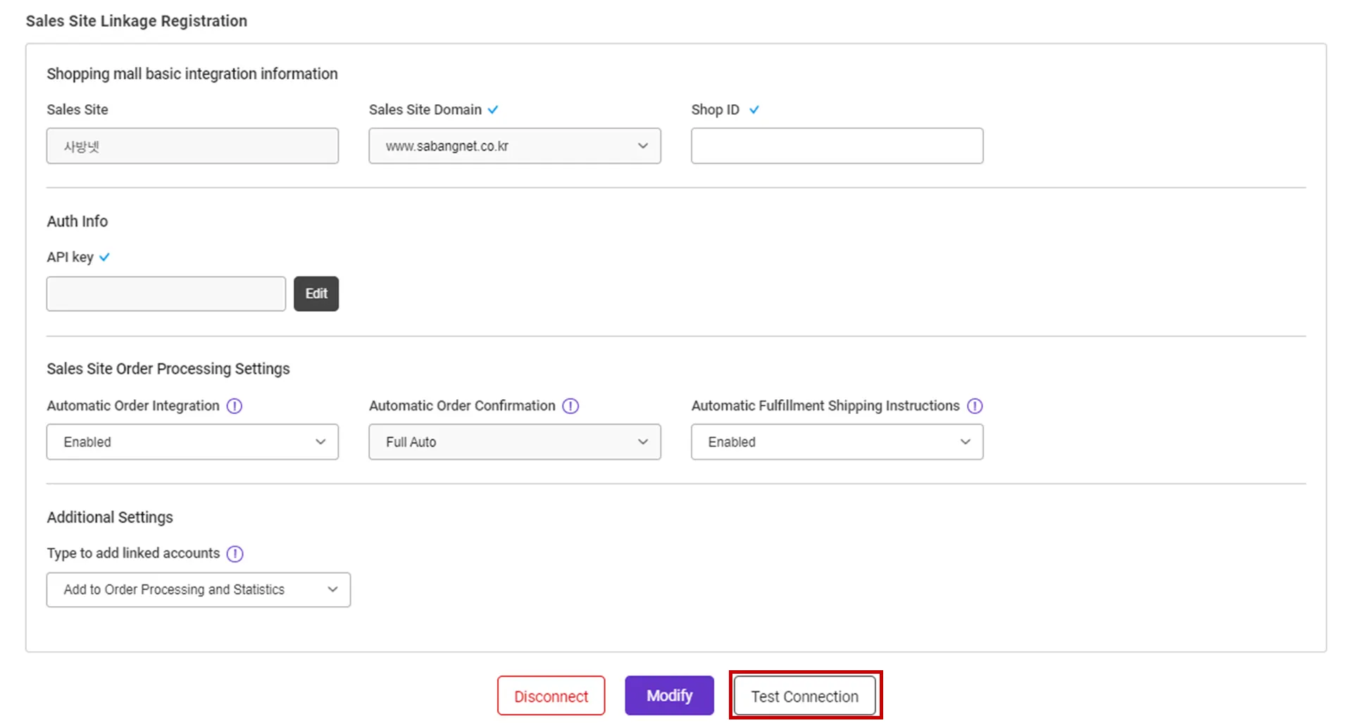 API key: Enter the Partner Token issued by 1. Get API KEY from Sabangnet