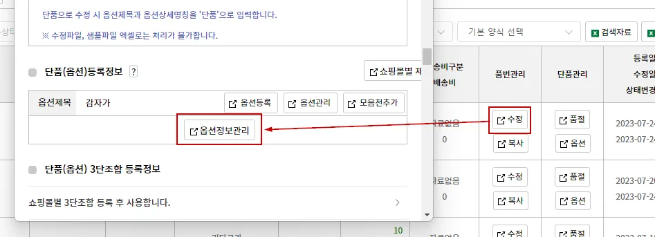 Sabangnet > Product management> Modification of Sabang Net product inquiry>Click the [Modify] button under 'Manage item numbers’ > Click [Manage Options Information] button in a New Window