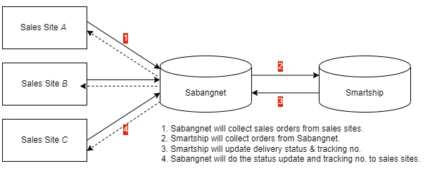 Sabangnet is a solution that can collect orders from various sales sites and handle tasks such as processing orders and sending waybills. At this time, if you add an linkage with SmartShip, SmartShip will only process the linkage with Sabangnet, and the transmission to the sales sites where the actual order has occurred will be processed by Sabangnet.