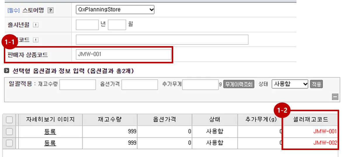 オプションがある選択商品の場合は、オプションごとに 「セラー在庫コード」を入力します。