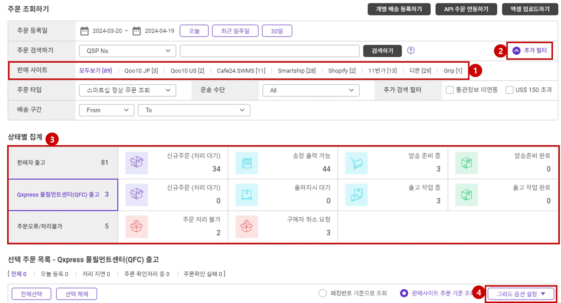 판매사이트 주문 기준 조회 : 신규로 추가된 그리드 보기 기능으로, 하나의 QSP 패킹 번호에 포함된 쇼핑몰의 주문번호와 상품정보를 행별로 구분하여 보여줍니다. 주문 상세보기를 클릭하지 않아도 하나의 그리드에서 상품 상세정보를 확인할 수 있습니다.