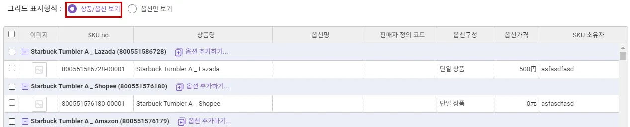 상품/옵션 보기 : 대표 상품과 옵션 상품을 동시에 표시합니다.