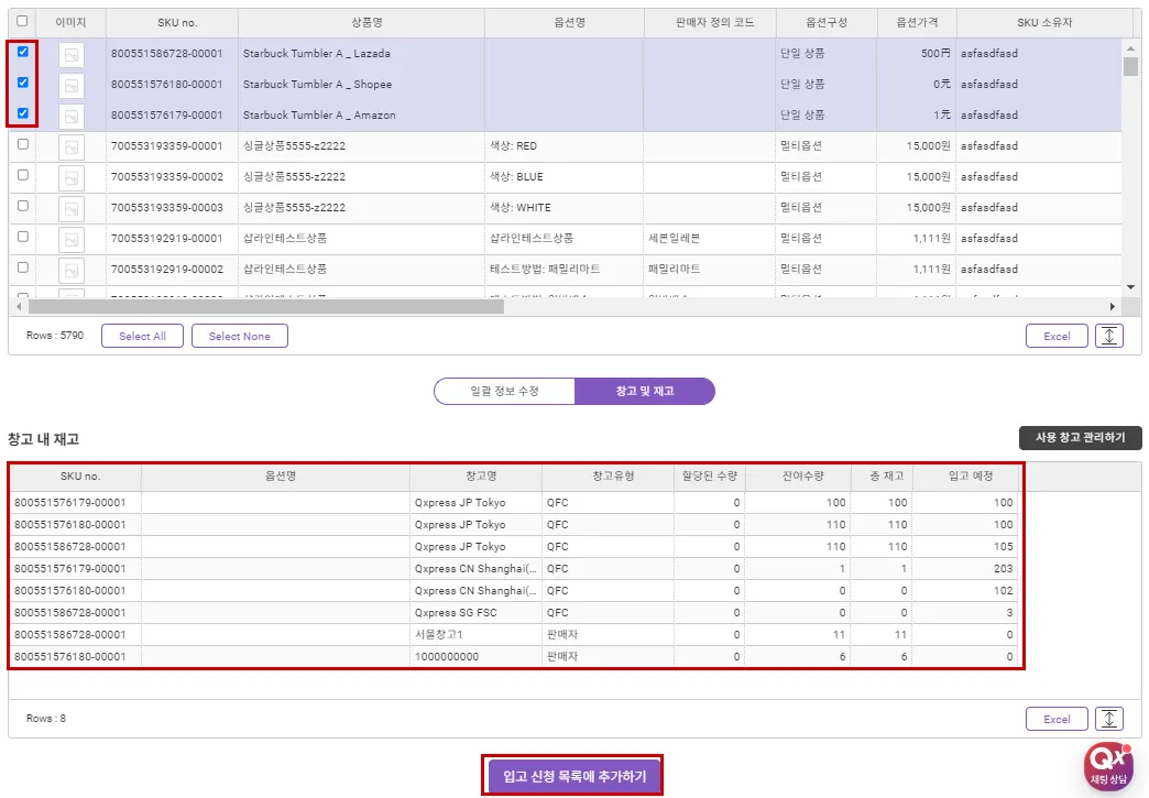 여러 SKU를 일괄로 선택하여 선택한 SKU의 재고만 빠르게 확인할 수 있으며, 선택한 SKU들을 입고 예정 목록에 추가할 수 있습니다.