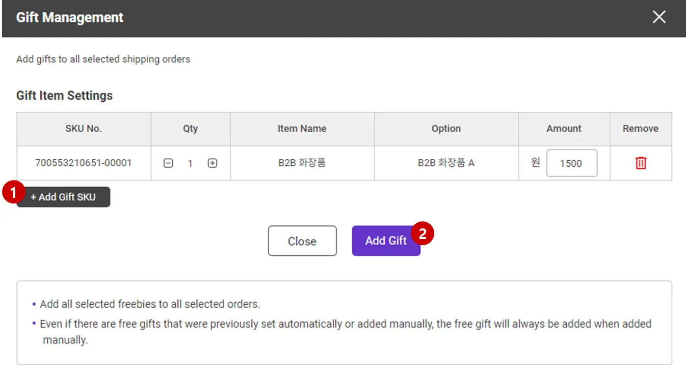 Click the [+Add Gift SKU] button to select a free gift SKU. You can select one or more SKUs and adjust the quantity after adding them.