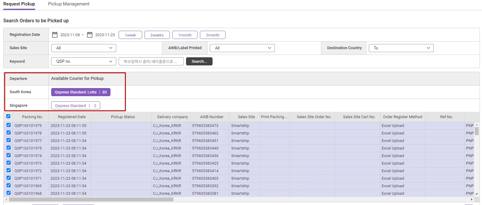 Orders subject to pickup are classified according to the departure country, and couriers available for pickup are displayed.