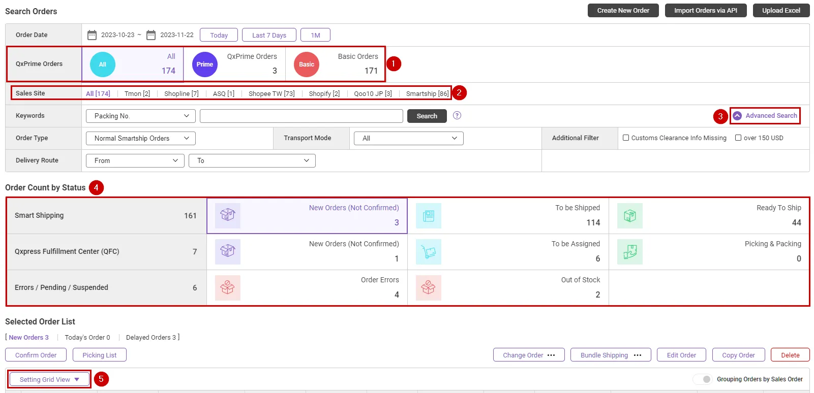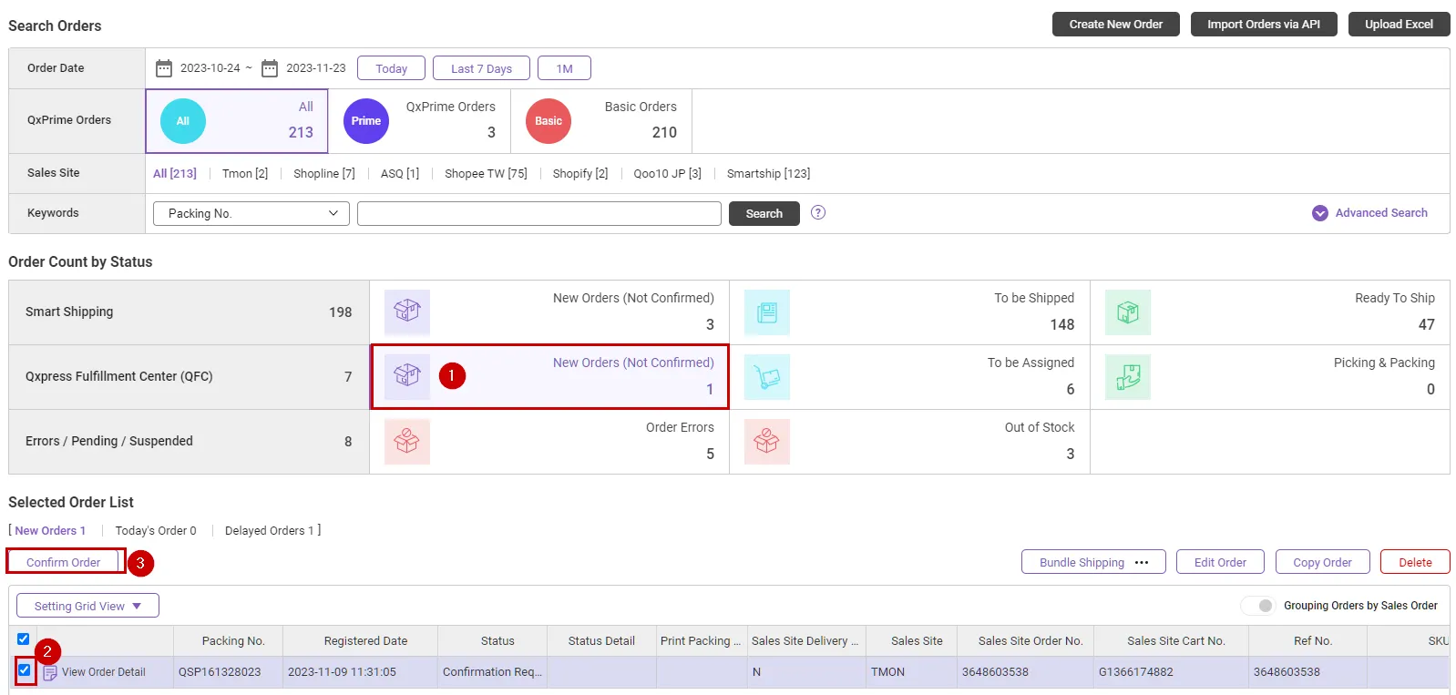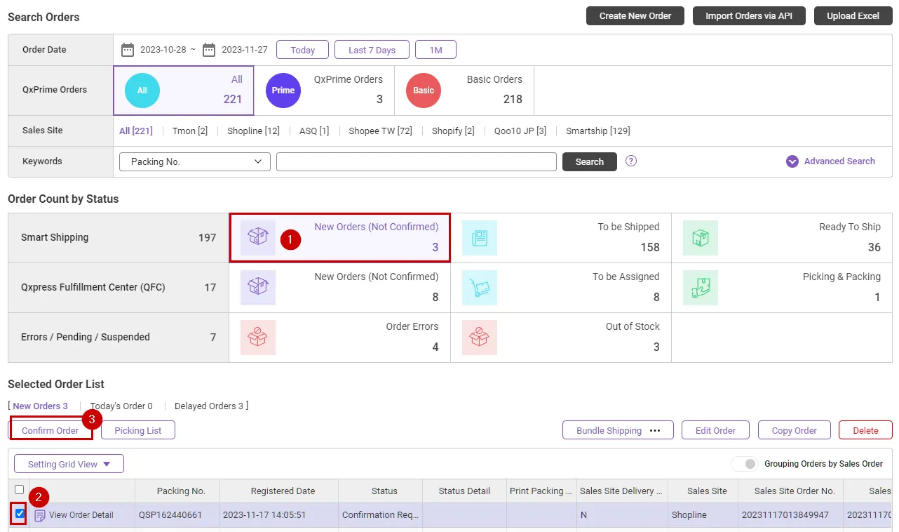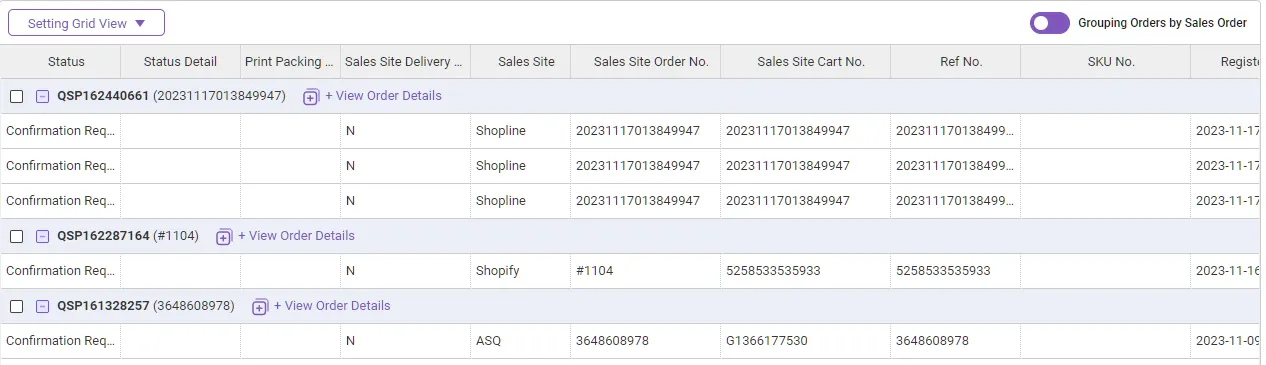 Grouping Orders by Sales Order : A new grid view function has been added that shows the order number and product information from the sales site included in one QSP packing number, separated by row. You can check your order details more quickly and easily by viewing product details in one grid without having to click View Order Details.