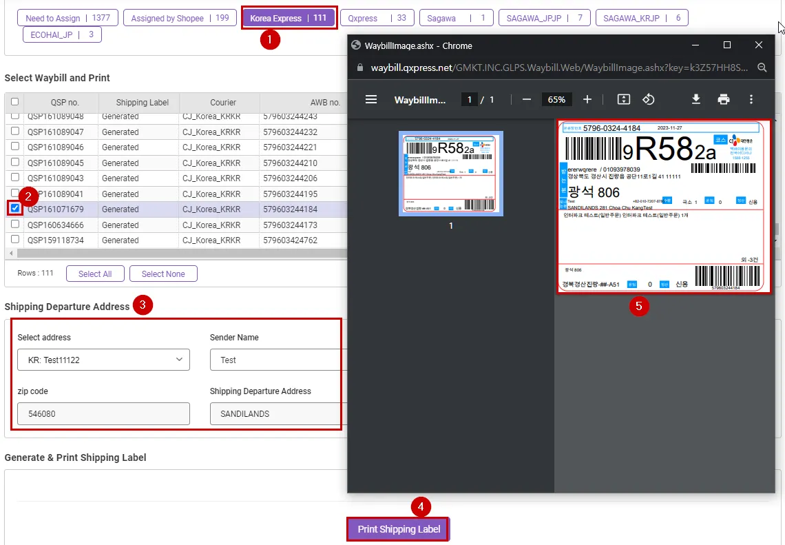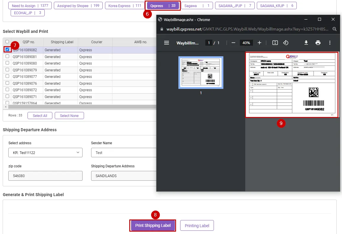 (QXPRESS is assigned as the default shipping company, and the existing QSP number is assigned as the shipping label number.)